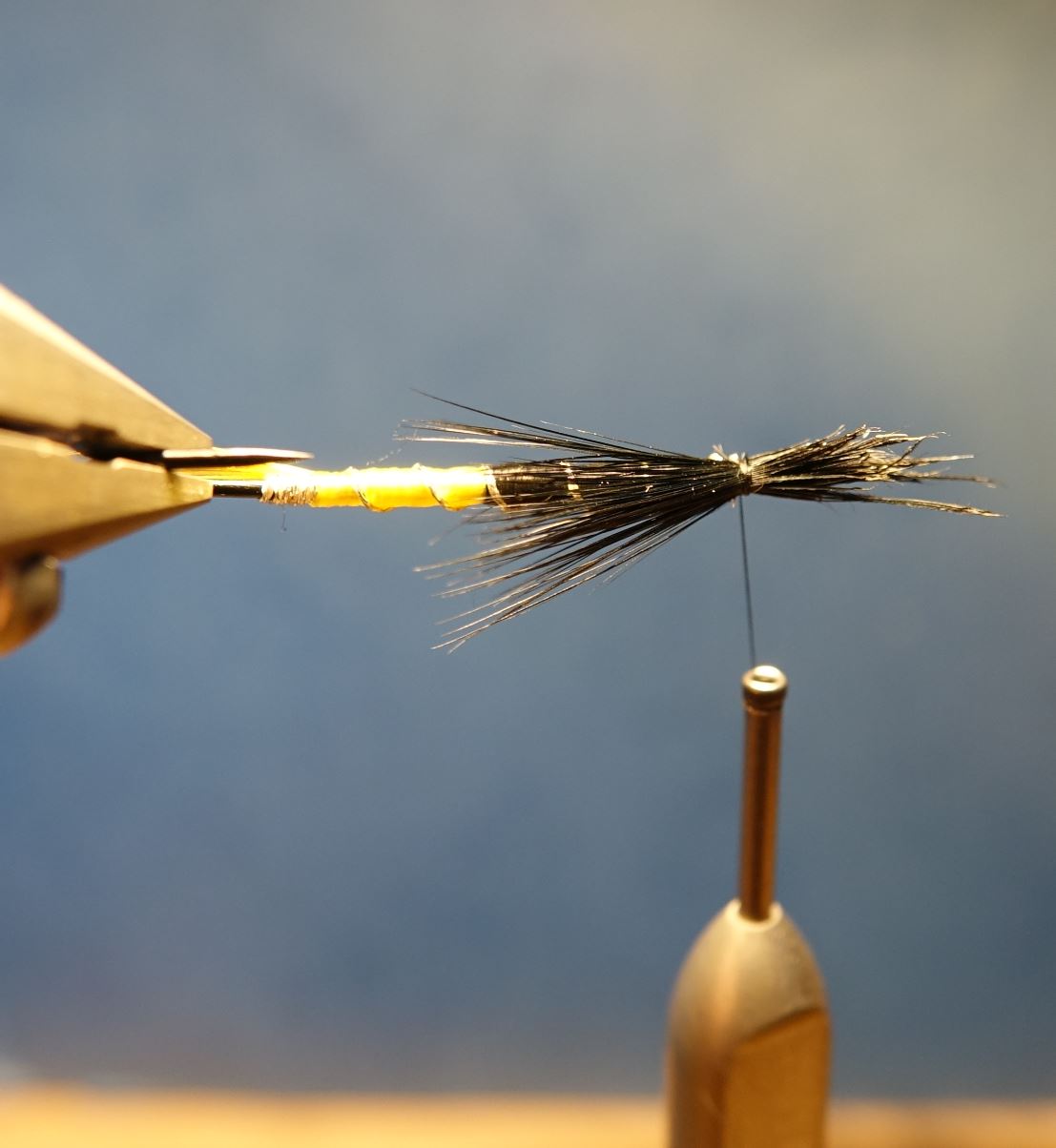 Tout comme vous l'avez fait avec la soie jaune, faites des enroulements réguliers avec la soie Danville noire, de manière à former la moitié antérieure du corps. Fixez alors avec la soie de montage, après avoir préalablement déroulée celle-ci sur quelques tours.