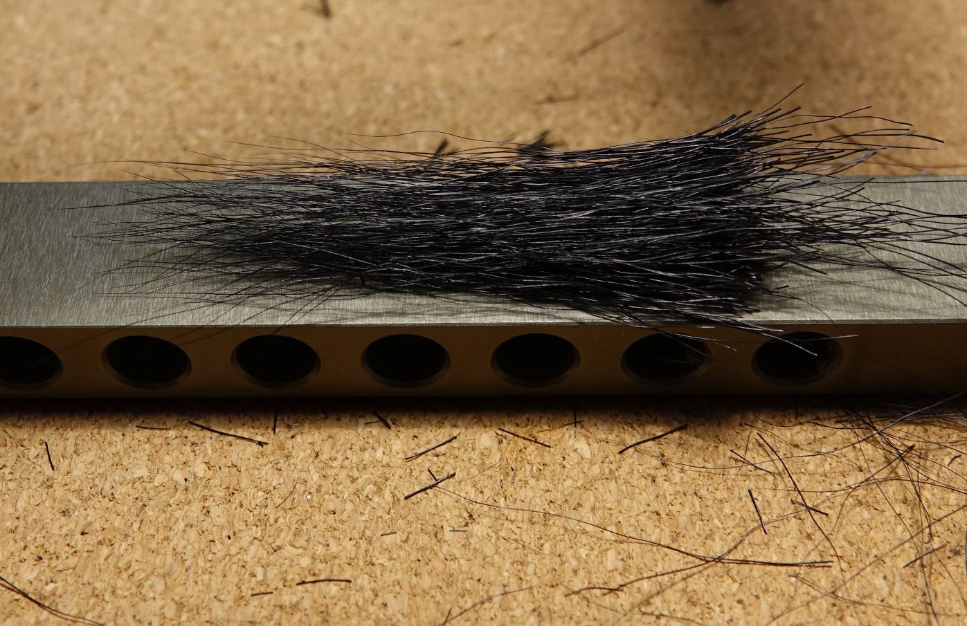 Tout comme pour les barbes de hackle, il faut maintenant préparer une touffe de poils de bucktail noir. Le débat sur poils alignés (par les pointes) - ou pas - pourrait resurgir, chaque point de vue se tenant. J'ai donc plus ou moins alignés les poils par la pointe. Un compromis entre les deux approches. Ces poils vont permettre de former l'aile, qui ne doit pas être trop fournie.