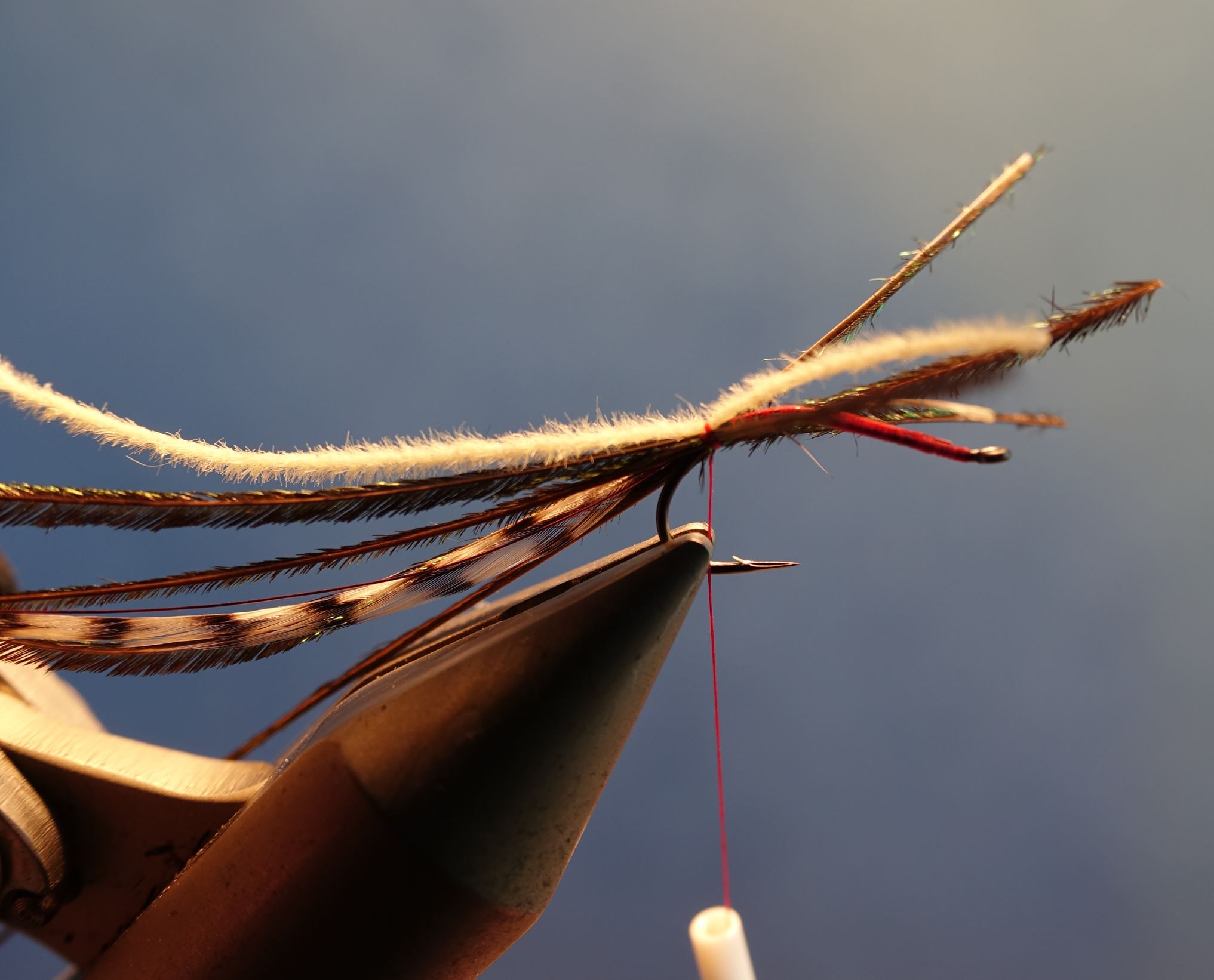 pour ramener alors la soie de montage à l'oeillet, en emprisonant les bouts libres (hackle, herls et microchenille). Coupez l'excédant.