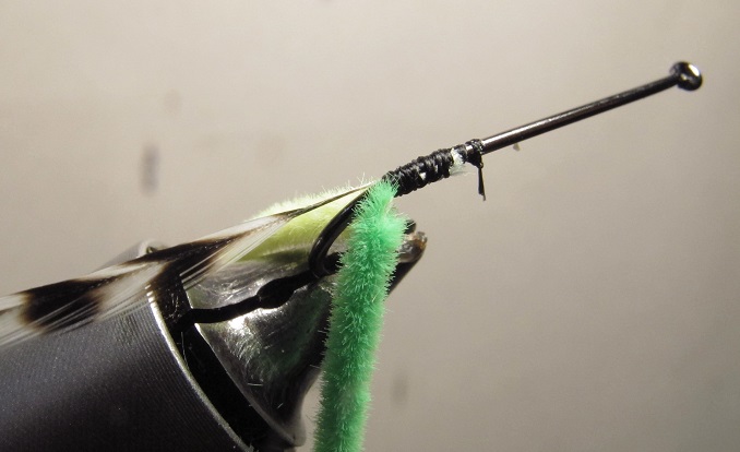Miantenant, il vous faut enrouler en palmer la lancette de coq, que vous fixerez derrière l'oeillet avec la soie de montage. Faite une petite tête avec la soie de montage, puis le noeud final. Déposez une goutte de résine UV noire et polymérisez aux UV.