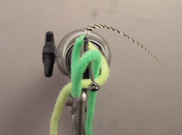 Grâce à la soie de montage, fixez le brin vert de votre coté de l'hameçon et le jaune à l'opposé.