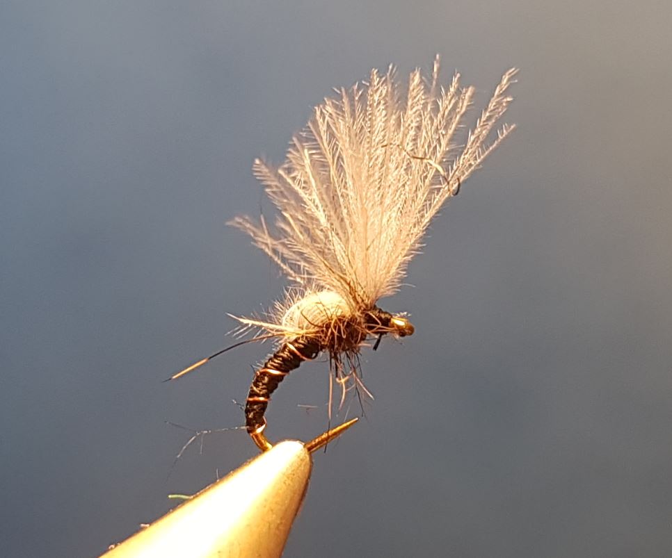 Formez une petite tête, faite un nœud final, et coupez votre soie de montage. Une microgoutte de "Head cement", coupez un peu les extrémités des barbes de CDC. Voila, votre mouche est faite.