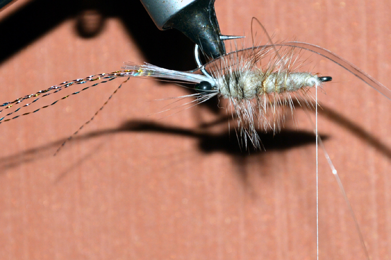 Arrêter le nylon, couper l'excédent, ainsi que la soie de montage. Tailler la queue à la longueur désirée, en la séparant en deux parties avec les ciseaux afin de dégager l'œillet. Sécuriser avec une goutte de superglue. Vous pouvez revenir à l'avant et y fixer la soie de montage puis l'enrouler autour du rostre. Sécuriser avec une goutte de superglue. Vous pouvez aussi passer la carapace à la résine UV pour un aspect plus flatteur et donner un peu plus de densité.