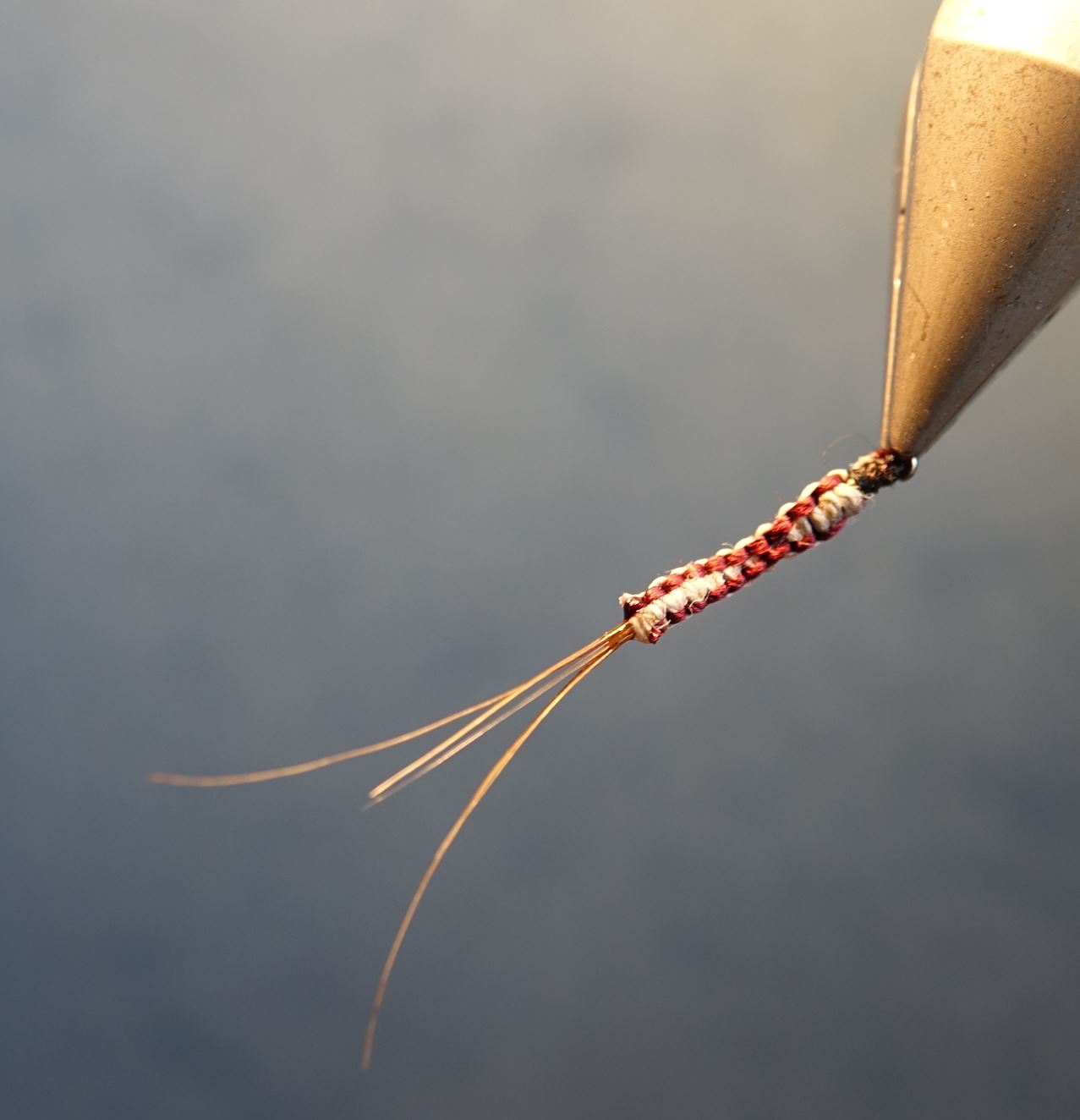 La taille des poils dépassant derrière la courbure doit être égale à la taille des cerques + taille de l'abdomen. Nous sommes sur un montage d'Ecdyo, n'oubliez pas que ces éphémères ont deux cerques proportionnellement très grandes. Si vous souhaitez monter un autre modèle d'éphémère, adaptez cette taille aux proportions de l'insecte imité.