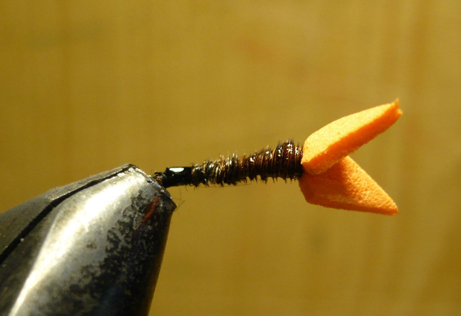 Vriller sur la soie de montage une longue mèche de dubbing olive ou orange ou de la couleur qui vous plaît.