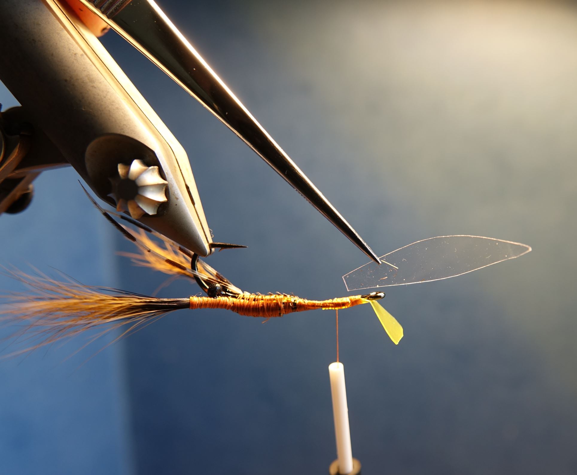 En tirant sur son extrémité (pas facile avec la courbure de l'hameçon, faites comme vous pouvez), vous allez fixer le film plastique juste derrière les yeux avec quelques tours de soie de montage.