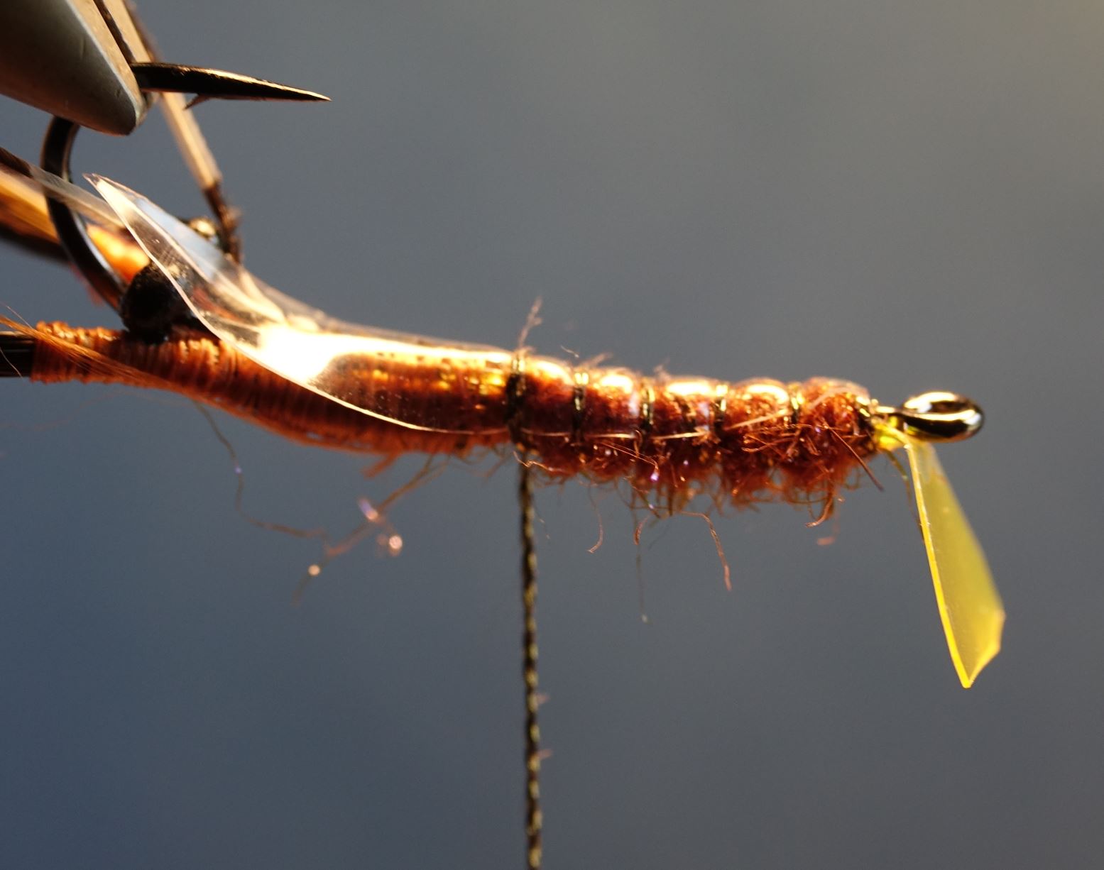 Cette cinquième étape s'intéresse au montage de l'abdomen. C'est à dire qu'il va vous falloir fixer le telson (la queue), l'exuvie (la carapace), le fil permettant le cerclage, et l'ice dub. Cette étape n'est pas difficile, techniquement parlant. Pour plus de visibilité, je l'ai détaillée en deux étapes: