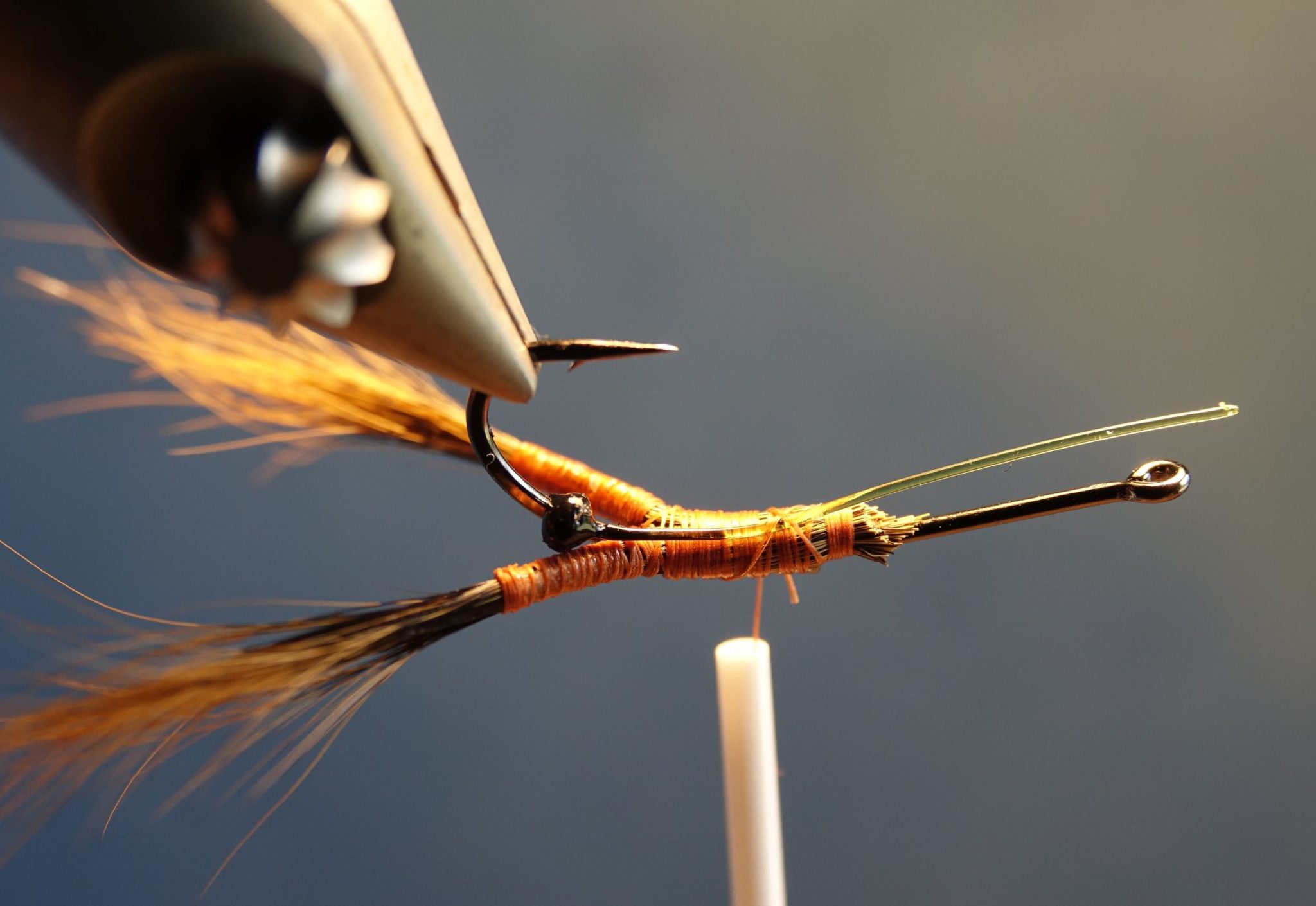Les pinces se font avec des poils de queue d'écureuil gris, que vous aurez préalablement teint en orange, comme décrit dans cet article. Le principe de la réalisation des pinces est en tout point calqué sur le principe de la réalisation d'un abdomen détaché d'éphémère, lorsqu'il est réalisé en poils de cervidés.