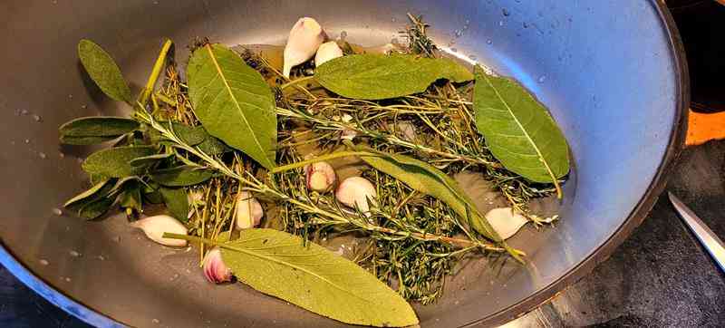Des aromates fraiches du jardin (sauge, romarin, thym, marjolaine) et des zestes de citrons bio