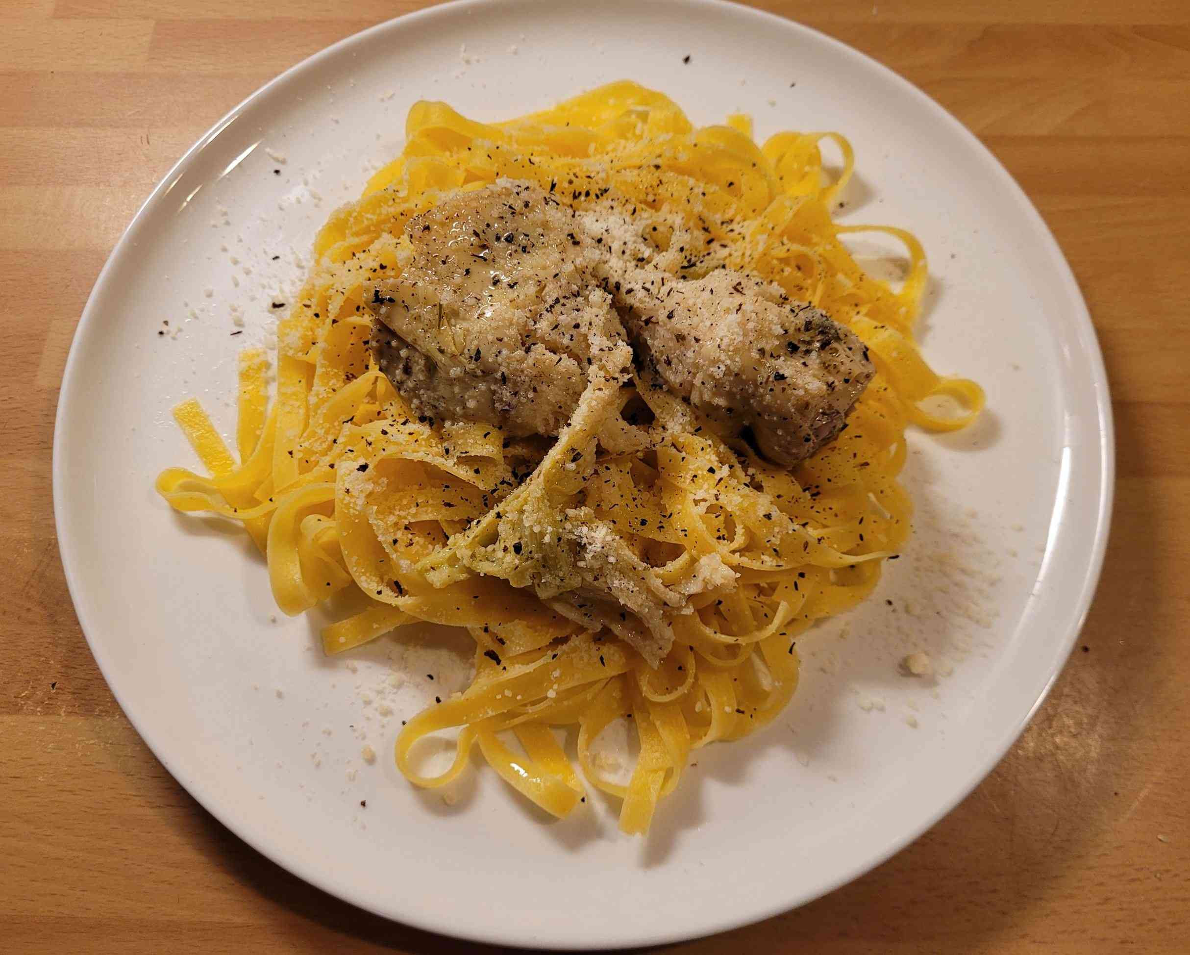 Simples pates “Antiqua pasta”, artichauds à l’huile maison,p armesan rapé, poivre noir de Sarawak…