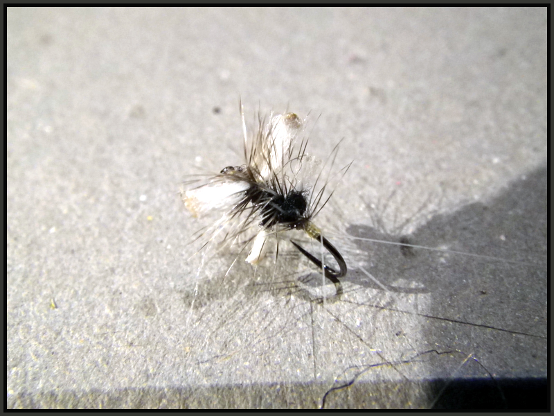 Mieux, ce modèle plus flou, les corps(4 montés perpendiculairement à la hampe) sont en poly brulé a l’extrémité, toujours sur h18 , un petit hackle grizzly est tourné en palmer.