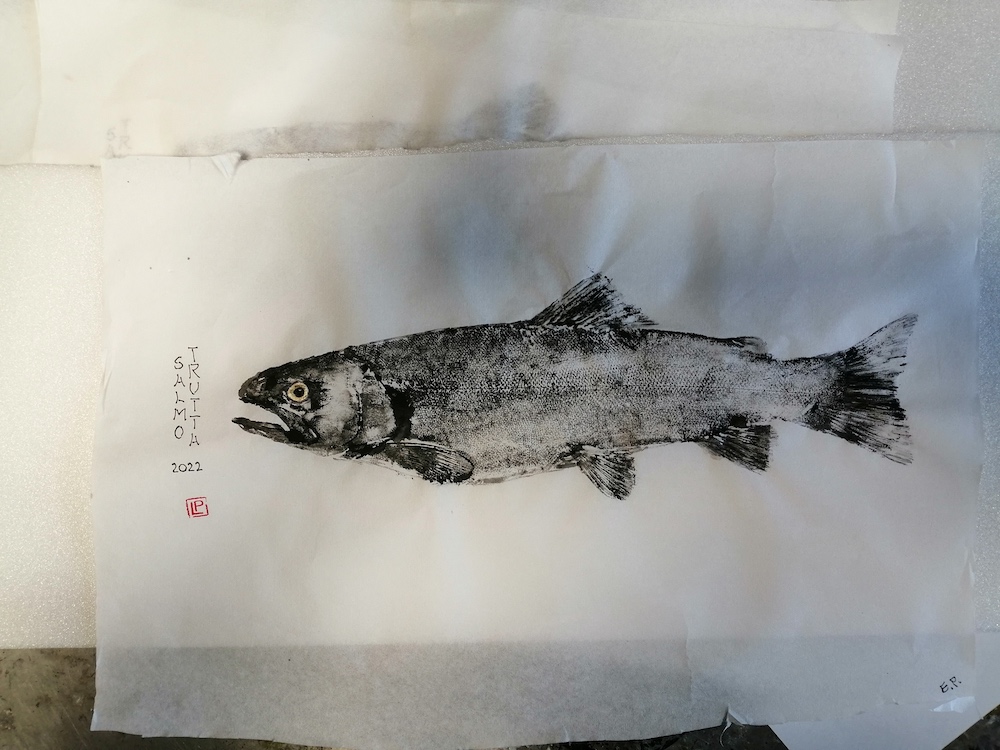 Après avoir appliqué de l’encre sur le poisson, déposé la feuille de papier dessus