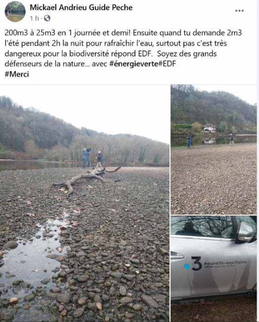 xxx                                                         Michael est un des rares guides sur la Dordogne a dénoncer les errances de la fée EDF qui s’accélèrent depuis bientôt 1 an,il n’hésite pas a convoquer la télé afin d’étayer ses observations et je lui tire mon chapeau.
