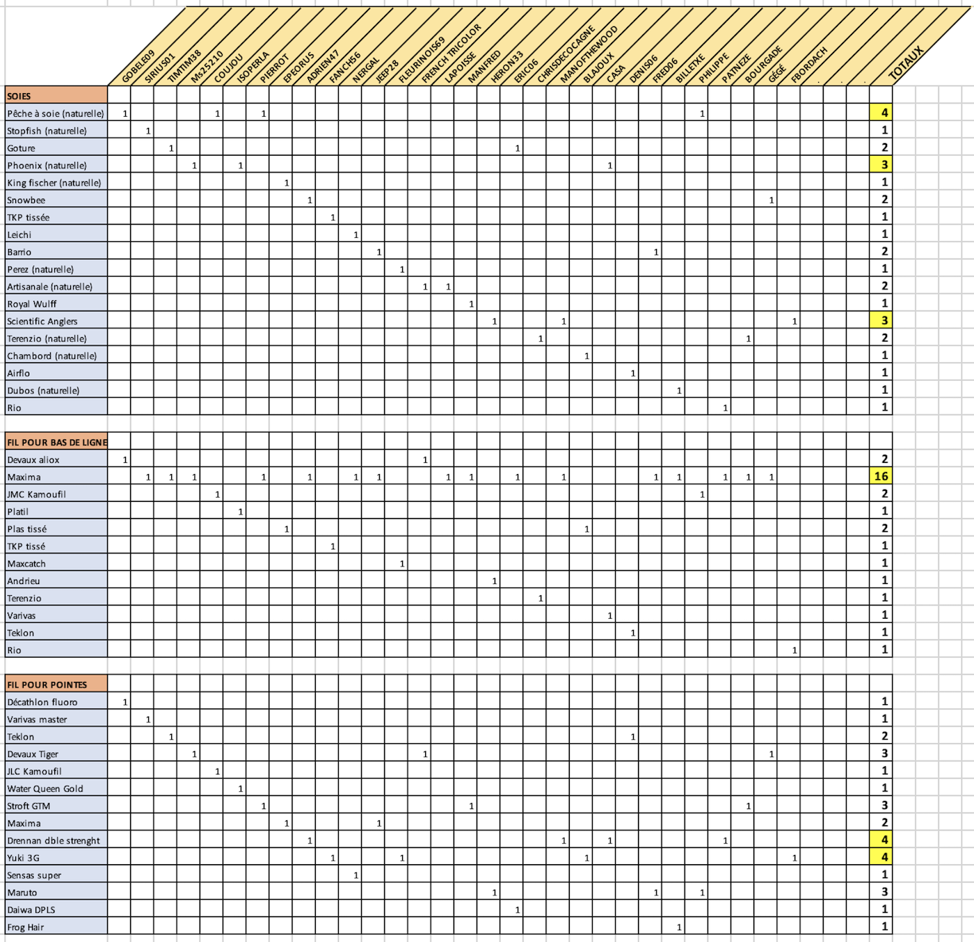 Il est néanmoins très intéressant de noter qu’un peu plus de la moitié des participants à ce sondage ont une préférence pour les soies naturelles (16 sur 30)Pour les fils de bas de ligne