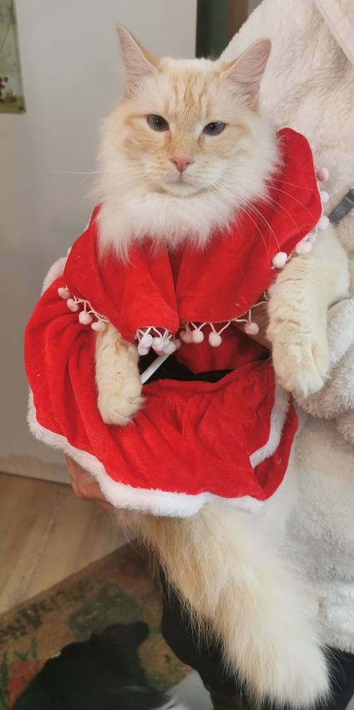 Elle est très forte en revanche, en chasse à la pantoufle, qu’elle consomme sans modération ! Très douée également en câlins avec son papaaaaaaa et les enfants !