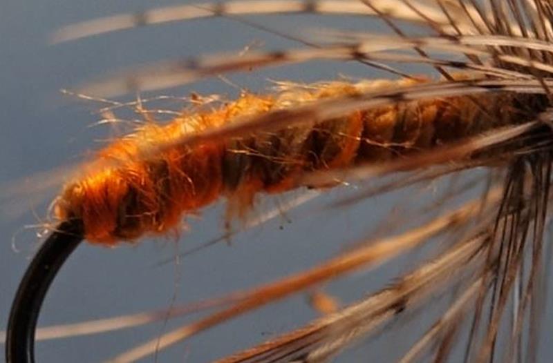 dans le livre de pequegnot : répertoire des mouches artificielles Françaises , il mentionne dans le montage ” une très légère mèche de laine orangée , diminuée progressivement en épaisseur vers la tête ” ???