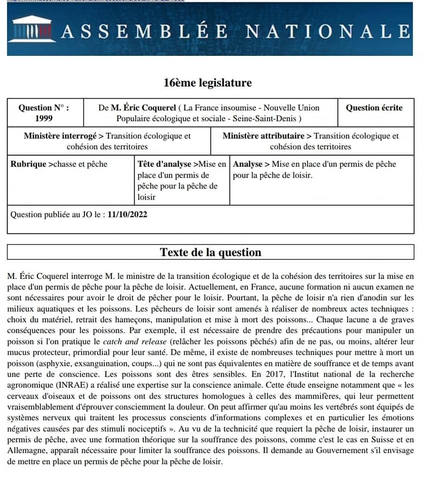 Une question écrite sur notre loisir, ils voudraient nous faire passer un permis de pêche: