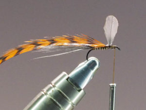 Je fixe un hacle de coq roux, puis j'amène la soie marron devant l'aile avant de la sécuriser par 2 demi-clefs, puis de la couper