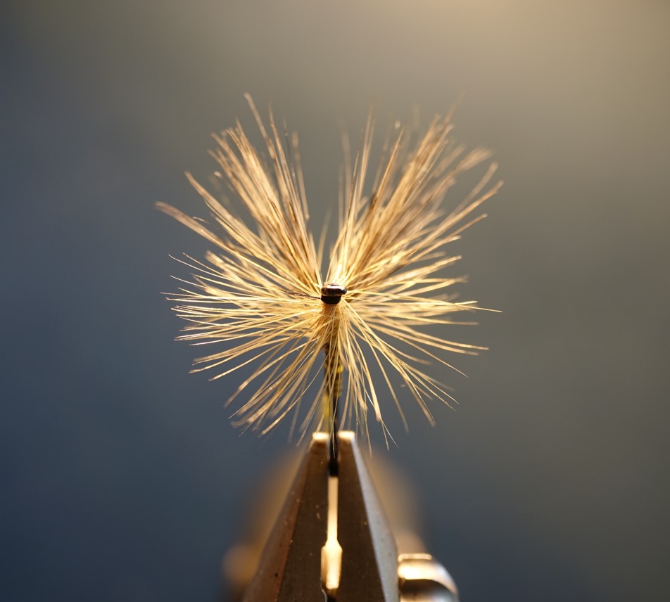 Ensuite, vous allez tourner le hackle en faisant trois tours derrière l'aile (pour ce faire, vous tiendrez avec l'autre main les ailes inclinées vers l'avant), puis trois tours devant l'aile (en tenant avec l'autre main les ailes vers l'arrière). Fixez le hackle avec la soie de montage.