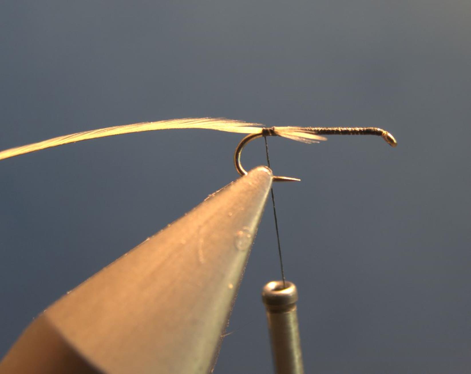 Ensuite, fixez le hackle par la pointe. Ceci est important, car les barbes sont plus longue vers la basse du rachis. Lors des enroulements de votre hackle, cela va donc donner une forme conique à votre mouche, la partie large du cône située à l'emplacement du thorax.