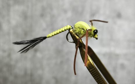 Enroulez alors le hackle devant les ailes. Faites 3-4 tours. Fixez la pointe du hackle avec la soie de montage. Coupez la pointe libre du hackle. Formez une petite tête avec la soie de montage, et faites le nœud final.