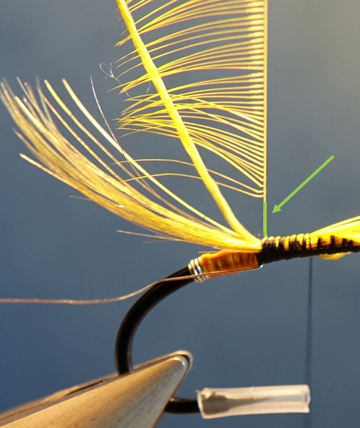 Si besoin, avec une aiguille, écartez les deux plumes pour que le barbes de hackle se positionnent entre elles. Globalement, l'extrémité des barbes du GP tippet doit arriver à la hauteur du tip.