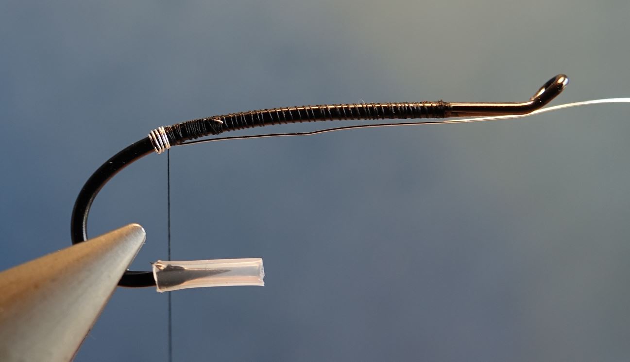 Puis formez le tip avec 4-6 tours de tinsel. Bloquez sur la face ventrale de l'hameçon avec la soie de montage.