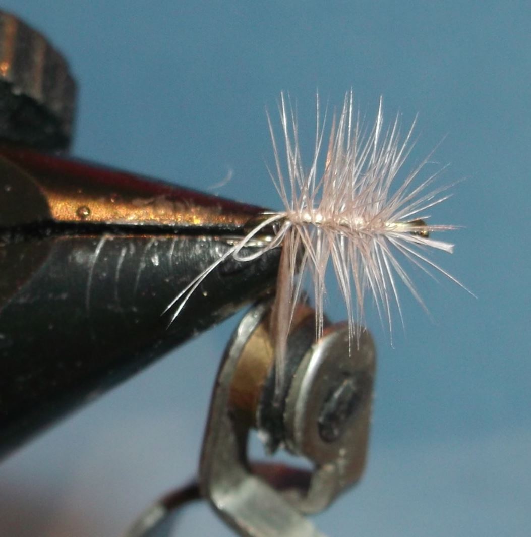 Tirez alors sur la base du hackle (qui est côté œillet), de manière à bloquer la pointe du hackle contre les spires de ce même hackle.
