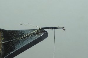 Posez un toupet de barbes de CDC rose (C'est pour vous, pas pour le poisson) Vous pouvez utiliser la couleur qui vous permettra de visualiser au mieux votre mouche qui s'utilise le soir. Fixez-le avec la soie de montage juste devant l'abdomen.
