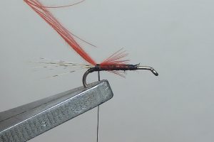 Vrillez alors cette plume de CDC rouge, et enroulez-la sur la hampe de manière à réaliser le thorax. Fixez-la avec la soie de montage, et coupez l'excédent.