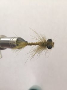 Enroulez la plume de CDC servant à simuler le thorax derrière les yeux, et fixez-la avec la soie de montage. Au même niveau, réalisez un dubbing loop et insérez-y des barbes de CDC. Vrillez soigneusement.