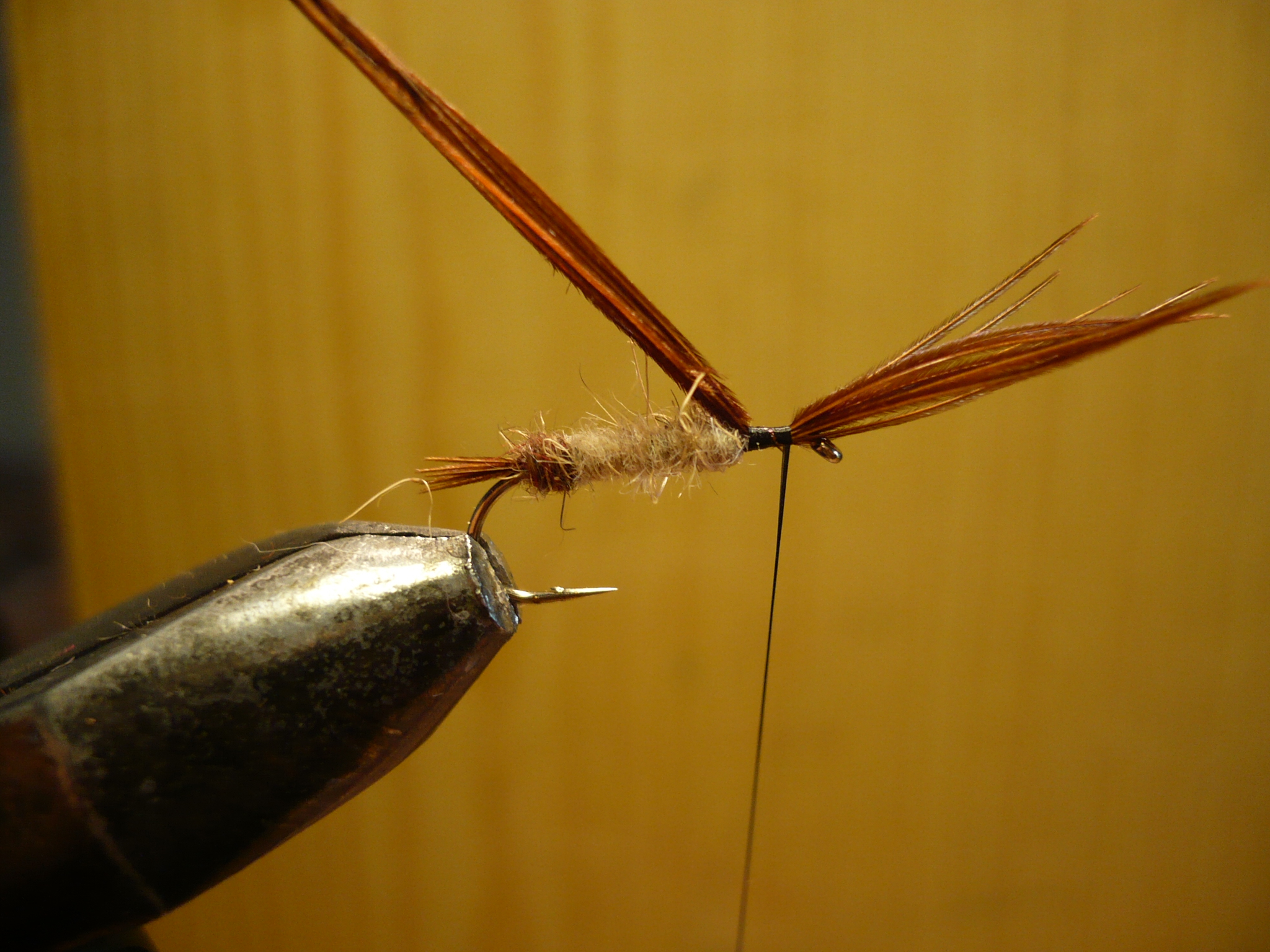 Eliminer l'excédant des barbes de faisan, revenir à la base des cerques et tourner/vriller une mèche de dubbing marron sur la soie de montage.