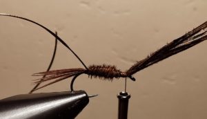 Une fois la tête terminée, bloquer la laine à dubbing avec la soie de montage.