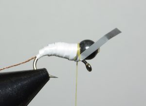 Fixer le polyfloss jaune à la courbure, puis le brin de fil marron qui servira au cerclage, et la bande de plastique blanc. Enrouler cette bande sur le sous-corps en plomb (pour éviter que le plomb n'apparaisse en transparence).