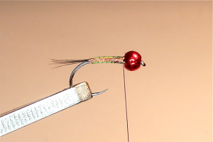 L'enrouler alors en spires superposées de manière à donner un peu de volume au corps de la perdigon, et la fixer derrière la bille avec la soie de montage.