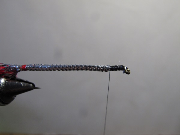 Enfiler maintenant le Mylar Piping sur la hampe et le fixer par un enroulement de soie de montage rouge au whip Finisher. Faites le dépasser de la courbure de l'hameçon en l'effilochant.