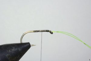 Faire la liaison de l'hameçon de queue sur l'hameçon de tête avec la tresse spinning verte en attente, en la ligaturant avec la soie de montage noire, puis coller la ligature.