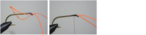 Ces 2 premières photos sont présentées pour expliquer comment se fait la liaison entre les 2 hameçons. Pour une meilleure compréhension et lisibilité, la soie a été choisie en couleur rouge et de grosse taille, alors qu'elle sera en tresse de spinning verte pour la fiche de montage.