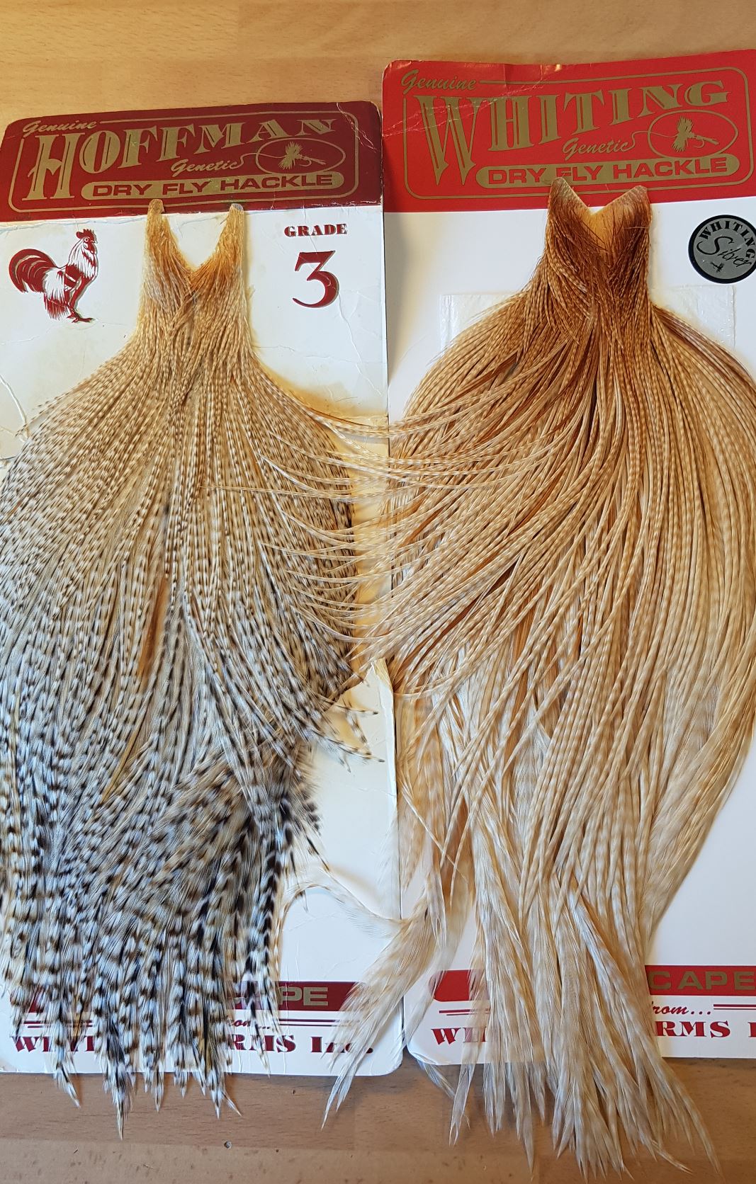 Sur la photo ci-dessous, vous voyez un demi cou Whiting (lignée « High and Dry » qui ne présente qu’un seul grade, équivalent au bronze ) grizzly naturel, et un cou Metz "magnum "en grade silver (à droite sur la photo) .